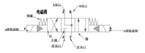 此电磁阀为三位四通阀,三位指此阀有3个方框,每个方框内箭头指向不同,表示其接通时状态不同。有P、T、A、B外部连接口,称为四通,分别代表进油口、出油口、A油口、B油口,此四个通在每个位上的位置都是固定的。a、b端电磁铁是我们的供电端,弹簧是用来复位的。