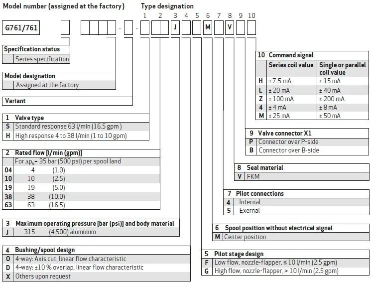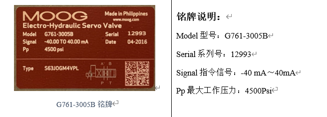 额定电流由伺服阀铭牌上Type(类型说明)的第10位代码来决定。例如G761-3005B铭牌上Type S63JOGM4VPL 的 第10位代码为“L”,则单线圈连接或并联连接时额定电流为±40mA,串联连接时额定电流为±20mA。