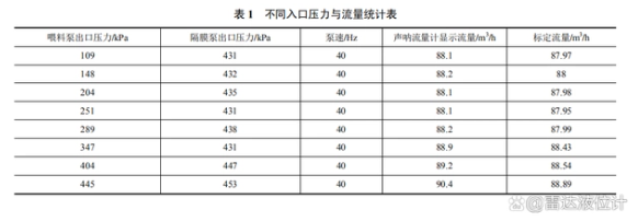通过调整喂料泵出口压力,观察隔膜泵流量变化,分析入口压力是否影响隔膜泵流量。系统输水,满管水后,切换阀门使水进入标定池。固定隔膜泵泵速,调整喂料泵出口压力,观察声呐流量计及标定池液位,记录相关数据。试验结果见表1。