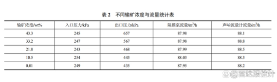 由表2可知:(1)矿浆浓度变化对隔膜泵流量基本无影响。(2)稳定的矿浆浓度对声呐流量计流量也基本无影响。但现场实际观察发现,浓度调整初期,声呐流量计显示流量有所波动,后期基本稳定。针对该问题,我们咨询了流量计厂家,其答复是:不稳定密度浆体确实对声呐流量计的测量有一定影响,但总体精度不超1%。因此,后期在结算时,需要考虑剔除该部分影响值。