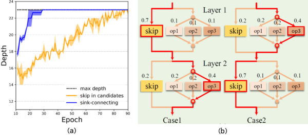 针对深度层面的搜索,现有算法通常直接将跨层(Skip)算子加入到待搜索候选算子集中。但由于跨层算子的非参数性以及与其他算子的互斥性,这种设计方式会导致网络深度的搜索不稳定,在整个搜索过程中有非常大的抖动。此外,跨层算子的直接加入也会引起架构冗余现象发生。为了解决这个问题,该研究设计了一个汇点连接搜索空间,将跨层算子的搜索剥离出来,增加深度搜索稳定性,同时也解决了架构冗余问题。