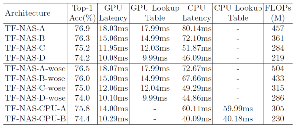 GPU和CPU上搜索架构结果,GPU时延测试批大小为32,CPU时延测试批大小为1