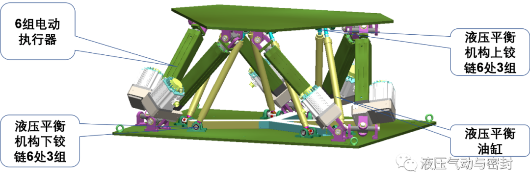 特点:该电动六自由度运动平台方案同时配置六自由度结构的液压力平衡装置,用于大吨运动载荷重力平衡,使得运动平台节能降耗,结构紧凑,还具有安全锁定能力。