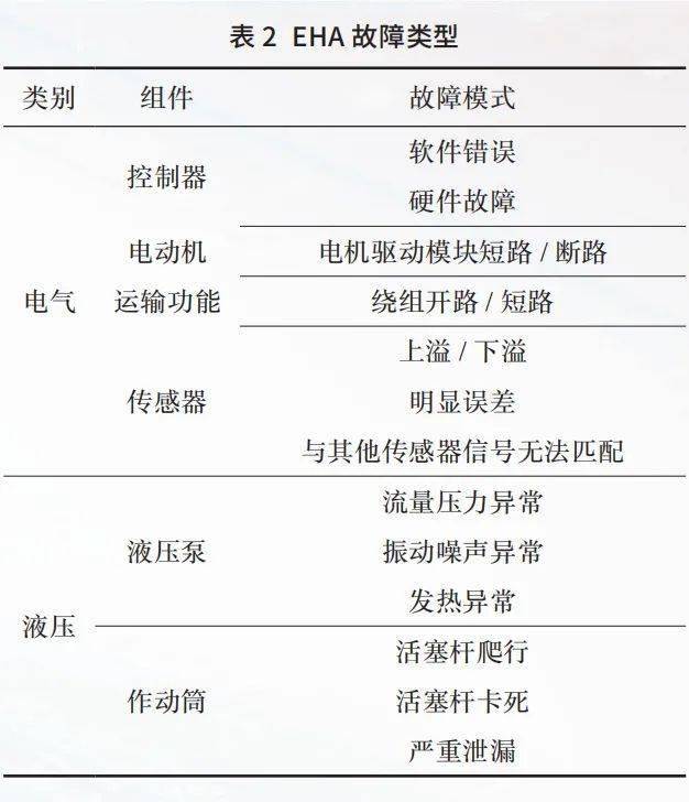 EHA健康管理是指对EHA(包括其子系统及零部件)工作的健康状态进行管理的相关活动,即进行故障监测,依据诊断结果,判断出当前的健康状况,并且预测出其剩余的有效寿命,最终有效隔离与处置故障。而目前EHA的健康管理技术研究处于起步阶段,利用统计数据分析进行故障诊断的研究还很少,技术尚不成熟,需要深入开展EHA特有的故障模式及其故障诊断方法的研究工作,为最终实现EHA的健康管理打下坚实的基础。表2列出了EHA主要的故障类型。