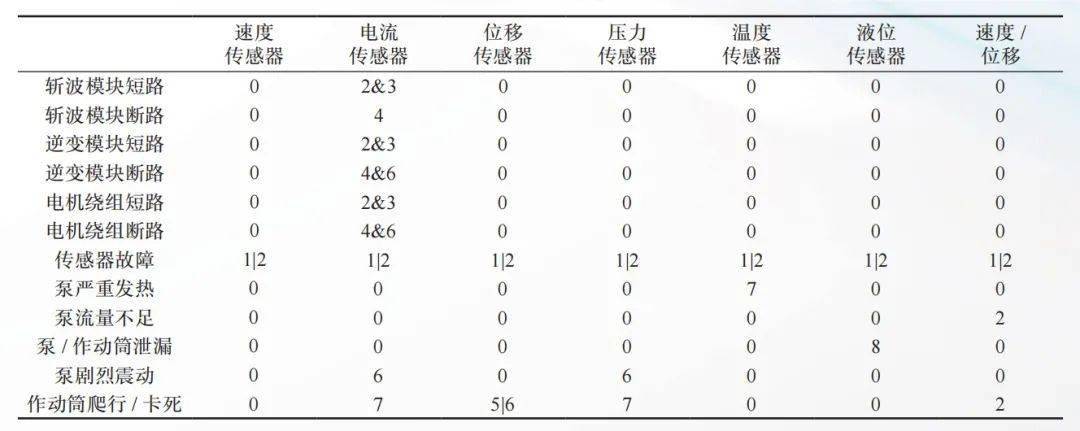 信号的编码方式如下:1-信号下溢、2-信号上溢、3-信号跳变、4-信号一段时间持续为零、5-信号一段时间保持某值 ( 不为零 )、6-信号出现脉动、7-信号超过正常、8-信号快速下降、0-信号正常;同时把电动机的速度值和作动筒的位移值的比较值进行编码:0-正常范围、1-小于正常范围内、2-超出正常范围。对各种故障进行列表分析,如表3所示。