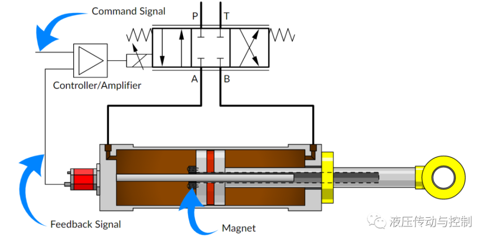 上述伺服阀的回路示例中,油缸内置位移传感器跟踪活塞杆位置变化。