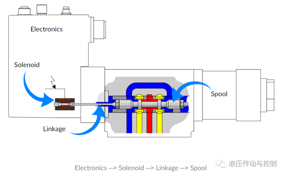 电气信号由集成电路提供,用于控制电磁铁磁场强度,通过机械连接机构从而控制阀芯位置。