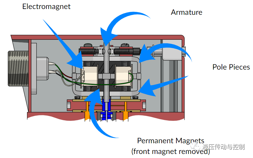 当来自控制电子设备的电信号为电磁铁供电时,它会导致电枢偏转。
