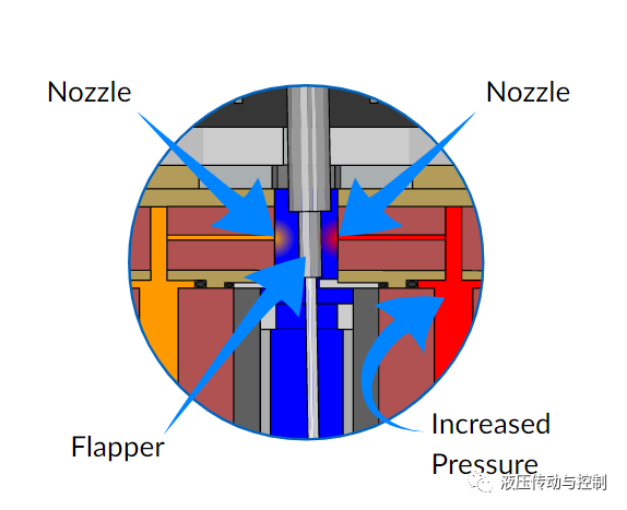 这种情况一直持续到衔铁与挡板一起重新居中并且不再限制来自任一喷嘴的流量(平衡)。