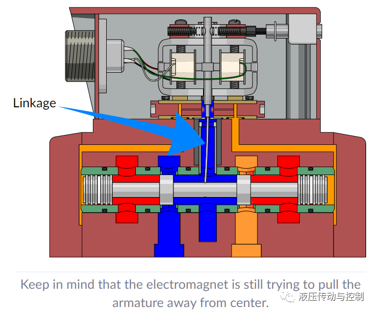 当阀芯移动时,阀芯和电枢之间的连杆在物理上迫使电枢返回其原始位置。