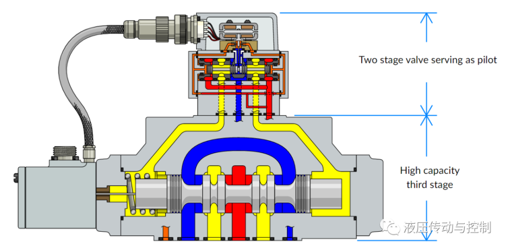 但两级阀的优势在于它们能够精确控制更大的阀芯,从而可以控制更大的流量和更高的工作压力。