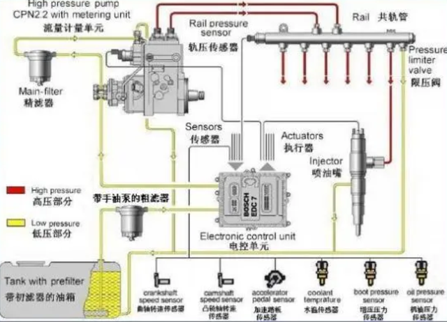 可造成轨压高的器件较多,传感器多与ECU相连,油路中的传感器信号异常时,ECU为保护发动机而主动打开泄压阀。