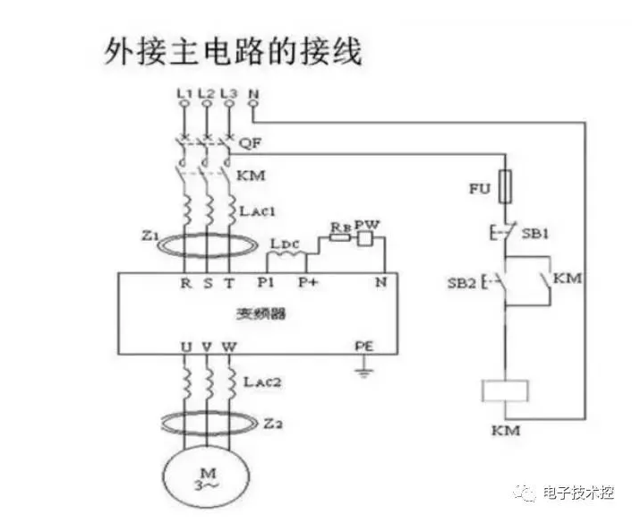若要切断变频器输入主电源,可按下按钮SB1,接触器KM线圈失电,KM主触点断开,变频器输入电源被切断。
