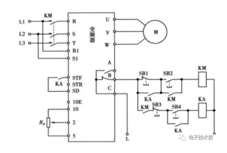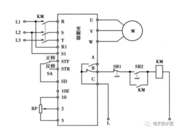 3、变频器异常保护:若变频器运行期间出现异常或故障,变频器B、C端子间内部等效的常闭开关断开,接触器KM线圈失电,KM主触点断开,切断变频器输入电源,对变频器进行保护。