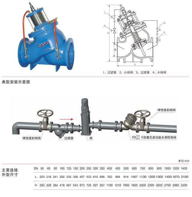 活塞式多功能水泵控制阀是安装在大口径给水管网系统的水泵出口处、防止介质倒流、水锤及水击现象的智能型阀 门。该阀兼具电动阀、逆止阀和水锤消除器三种功能, 可有效地提高供水系统的安全可靠性 。双腔室、双阀瓣结构可使阀门在停泵后迅速关闭90%(防止回流介质导致水泵反转 ), 再缓慢关闭其余10 %(消除破坏性水锤)活塞式阀门性能可靠、强度高、动作平稳 ,防 止开泵水锤和停泵水锤的场合 。只需操作水泵电机启闭按扭, 阀门即可按照水泵操作规程自动实现启闭, 流噩大、压力损失小。