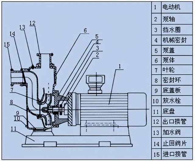 从不锈钢清水自吸泵结构组成图可以看自吸泵是由电动机、泵轴、挡水圈、机械密封、泵盖、泵体、叶轮、密封环、底盖板、放水栓、底盘、出口接管、加水阀、止回阀片、进口接管等零部件构成的。