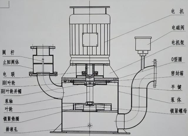 从WFB无密封自控自吸泵结构图可以看出无密封自控自吸泵是由电机、电磁阀、电机架、O型圈、密封箱、平键、泵体、锁紧螺母、排液孔、锁紧垫圈、叶轮、泵轴、副叶轮并帽、副叶轮、电联、止回阀体、阀杆等零部件组成的。